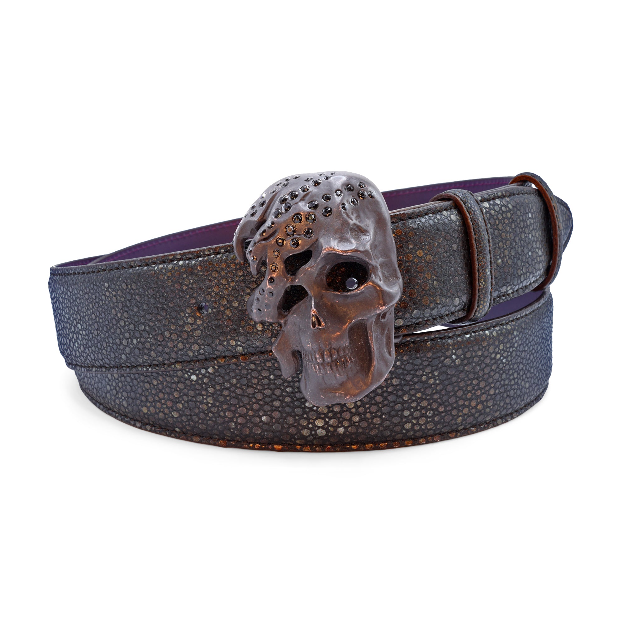 Dark Brown Metallic Mock Stingray Bubble Crystal Skull Belt