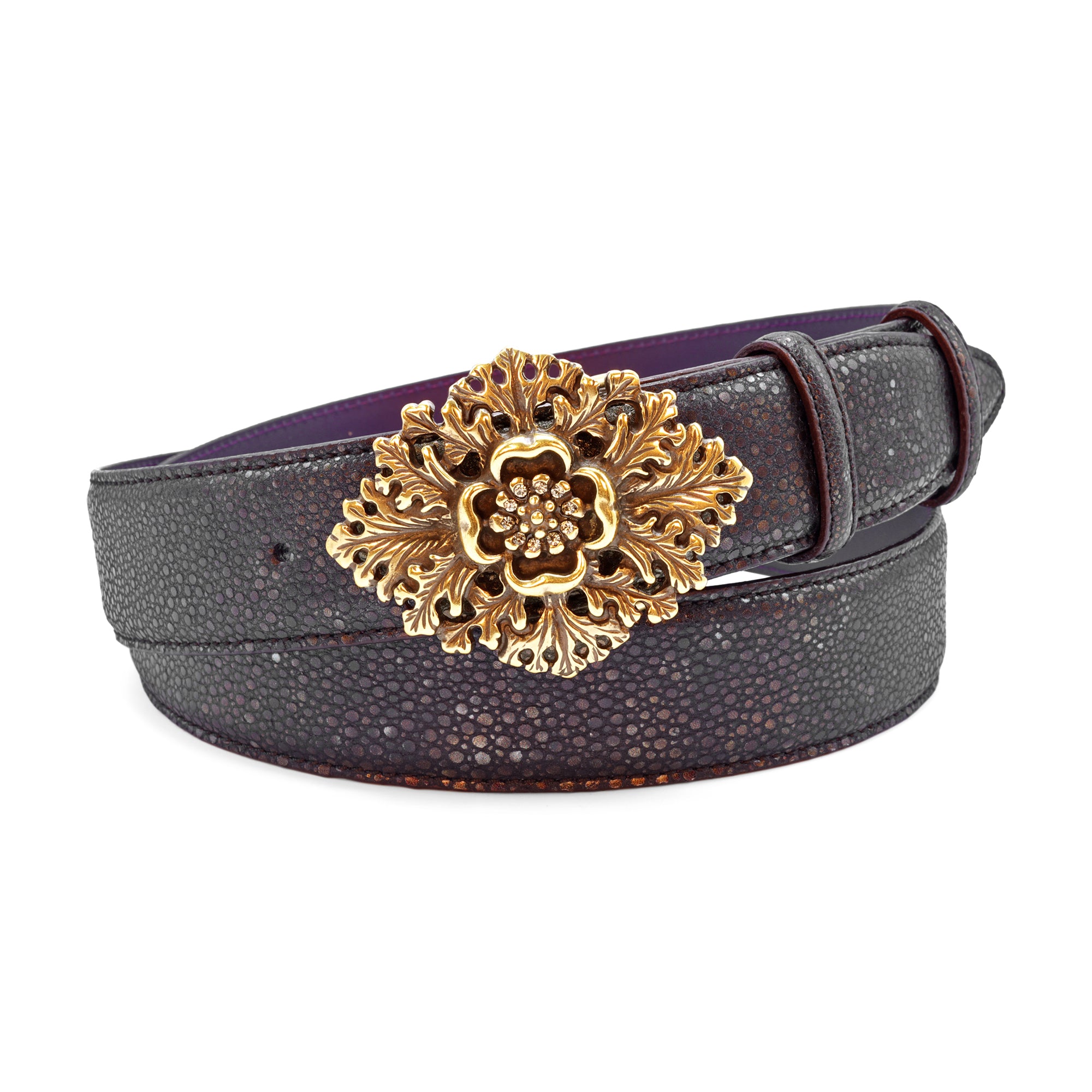 {"id":15379702972790,"title":"Dark Brown Metallic Mock Stingray Crystal Flower Belt","handle":"dark-brown-metallic-mock-stingray-crystal-flower-belt","description":"\u003cp class=\"whitespace-normal break-words\"\u003eWant a belt that feels both organic and ornate? I designed this one to celebrate natural forms with a touch of elegance. We've crafted it from metallic mock stingray leather in copper, brown and beige—a finish that moves through deep chocolate into burnished copper, with touches of caramel and bronze catching light as you wear it.\u003c\/p\u003e\n\u003cp class=\"whitespace-normal break-words\"\u003eThe crystal flower buckle is lovely—really lovely. It's a lattice leaf design with decorative leaves radiating outward from a central flower set with crystal inserts. There's something almost Victorian about the craftsmanship, but it never feels fussy or overdone. What I particularly love is how those little circles in the lattice actually mimic the scaled skin below. It's that kind of thoughtful detail that makes a design feel complete—buckle and leather speaking the same visual language.\u003c\/p\u003e\n\u003cp class=\"whitespace-normal break-words\"\u003eThe gold tone brings warmth that plays beautifully with all those copper and bronze notes in the leather. The crystals add just enough sparkle to catch the eye without overwhelming the organic, almost botanical feeling of the piece. It's refined and romantic, with a hint of vintage charm.\u003c\/p\u003e\n\u003cp class=\"whitespace-normal break-words\"\u003eThis works beautifully with flowing fabrics, vintage-inspired pieces, and anything in warm earth tones. Wear it with tailored trousers for a polished look, or let it define the waist of a midi dress. It brings elegance to denim, sophistication to casual knits, and looks stunning with rich autumn colours.\u003c\/p\u003e","published_at":"2025-10-13T16:49:18+01:00","created_at":"2025-10-10T16:18:08+01:00","vendor":"Elliot Rhodes","type":"belt","tags":["AW25","Buckle-Finish-Gold","Buckle-Type-Crystals","Buckle-Type-Plate Style","Gender-Women","Material-Animal Effect","Style-Smart Casual","Width-40mm"],"price":22000,"price_min":22000,"price_max":22000,"available":true,"price_varies":false,"compare_at_price":null,"compare_at_price_min":0,"compare_at_price_max":0,"compare_at_price_varies":false,"variants":[{"id":56419784327542,"title":"Choco","option1":"Choco","option2":null,"option3":null,"sku":"V967 642R","requires_shipping":true,"taxable":true,"featured_image":{"id":78681697124726,"product_id":15379702972790,"position":1,"created_at":"2025-10-13T16:48:47+01:00","updated_at":"2025-10-13T16:48:52+01:00","alt":"Choco","width":2000,"height":2000,"src":"\/\/elliotrhodes.com\/cdn\/shop\/files\/V967642R_1.jpg?v=1760370532","variant_ids":[56419784327542]},"available":true,"name":"Dark Brown Metallic Mock Stingray Crystal Flower Belt - Choco","public_title":"Choco","options":["Choco"],"price":22000,"weight":0,"compare_at_price":null,"inventory_management":"shopify","barcode":null,"featured_media":{"alt":"Choco","id":67066238632310,"position":1,"preview_image":{"aspect_ratio":1.0,"height":2000,"width":2000,"src":"\/\/elliotrhodes.com\/cdn\/shop\/files\/V967642R_1.jpg?v=1760370532"}},"requires_selling_plan":false,"selling_plan_allocations":[]}],"images":["\/\/elliotrhodes.com\/cdn\/shop\/files\/V967642R_1.jpg?v=1760370532","\/\/elliotrhodes.com\/cdn\/shop\/files\/V967642R_2.jpg?v=1760370531","\/\/elliotrhodes.com\/cdn\/shop\/files\/V967642R_3.jpg?v=1760370532","\/\/elliotrhodes.com\/cdn\/shop\/files\/Purple_Lining_with_ER_Sayings.jpg?v=1763562325","\/\/elliotrhodes.com\/cdn\/shop\/files\/gift-box_da682f46-9532-4da7-8eff-aaf4144f8510.jpg?v=1763562325"],"featured_image":"\/\/elliotrhodes.com\/cdn\/shop\/files\/V967642R_1.jpg?v=1760370532","options":["Colour"],"media":[{"alt":"Choco","id":67066238632310,"position":1,"preview_image":{"aspect_ratio":1.0,"height":2000,"width":2000,"src":"\/\/elliotrhodes.com\/cdn\/shop\/files\/V967642R_1.jpg?v=1760370532"},"aspect_ratio":1.0,"height":2000,"media_type":"image","src":"\/\/elliotrhodes.com\/cdn\/shop\/files\/V967642R_1.jpg?v=1760370532","width":2000},{"alt":"Choco","id":67066238665078,"position":2,"preview_image":{"aspect_ratio":1.0,"height":2000,"width":2000,"src":"\/\/elliotrhodes.com\/cdn\/shop\/files\/V967642R_2.jpg?v=1760370531"},"aspect_ratio":1.0,"height":2000,"media_type":"image","src":"\/\/elliotrhodes.com\/cdn\/shop\/files\/V967642R_2.jpg?v=1760370531","width":2000},{"alt":"Choco","id":67066238697846,"position":3,"preview_image":{"aspect_ratio":1.0,"height":2000,"width":2000,"src":"\/\/elliotrhodes.com\/cdn\/shop\/files\/V967642R_3.jpg?v=1760370532"},"aspect_ratio":1.0,"height":2000,"media_type":"image","src":"\/\/elliotrhodes.com\/cdn\/shop\/files\/V967642R_3.jpg?v=1760370532","width":2000},{"alt":"Packaging","id":66098978423158,"position":4,"preview_image":{"aspect_ratio":1.0,"height":2000,"width":2000,"src":"\/\/elliotrhodes.com\/cdn\/shop\/files\/Purple_Lining_with_ER_Sayings.jpg?v=1763562325"},"aspect_ratio":1.0,"height":2000,"media_type":"image","src":"\/\/elliotrhodes.com\/cdn\/shop\/files\/Purple_Lining_with_ER_Sayings.jpg?v=1763562325","width":2000},{"alt":"Packaging","id":65653452833142,"position":5,"preview_image":{"aspect_ratio":1.0,"height":1000,"width":1000,"src":"\/\/elliotrhodes.com\/cdn\/shop\/files\/gift-box_da682f46-9532-4da7-8eff-aaf4144f8510.jpg?v=1763562325"},"aspect_ratio":1.0,"height":1000,"media_type":"image","src":"\/\/elliotrhodes.com\/cdn\/shop\/files\/gift-box_da682f46-9532-4da7-8eff-aaf4144f8510.jpg?v=1763562325","width":1000}],"requires_selling_plan":false,"selling_plan_groups":[],"content":"\u003cp class=\"whitespace-normal break-words\"\u003eWant a belt that feels both organic and ornate? I designed this one to celebrate natural forms with a touch of elegance. We've crafted it from metallic mock stingray leather in copper, brown and beige—a finish that moves through deep chocolate into burnished co