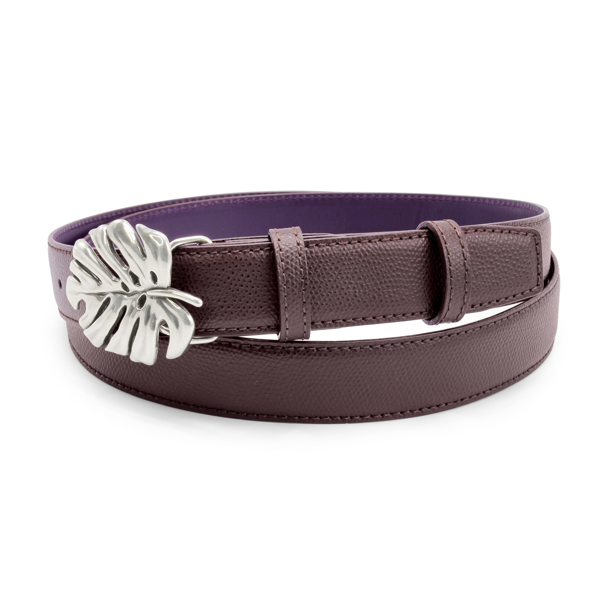 I wanted a brown belt that felt fresh rather than conservative, so I paired our dark brown sleek Novak strap with a palm-frond buckle whose cut-out leaves let the leather breathe. The openwork design allows the warm brown to seep through the fronds, giving the piece lift and movement; the softly curved, satin-silver finish keeps it modern and refined without shouting. We craft the Novak strap in our Dauphin leather—supple, with a subtle saffiano-style micro-grain and a gentle mid-sheen that reads polished, not glossy. We’ve kept the construction intentionally slimmer and lighter so it moulds to the body and slides cleanly through dress or trouser loops. It’s comfortable, elegant, and built to be reached for often. Style notes: the rich brown tone plays beautifully with navy, denim, olive, cream and camel, and it also softens black for a sophisticated high-low mix. With tailoring it adds an organic, sculptural accent; with knitwear or a tee and jeans it brings easy texture and interest. Think of it as your quiet statement—the versatility of brown, elevated by a buckle that feels airy, fluid and just a little whimsical.