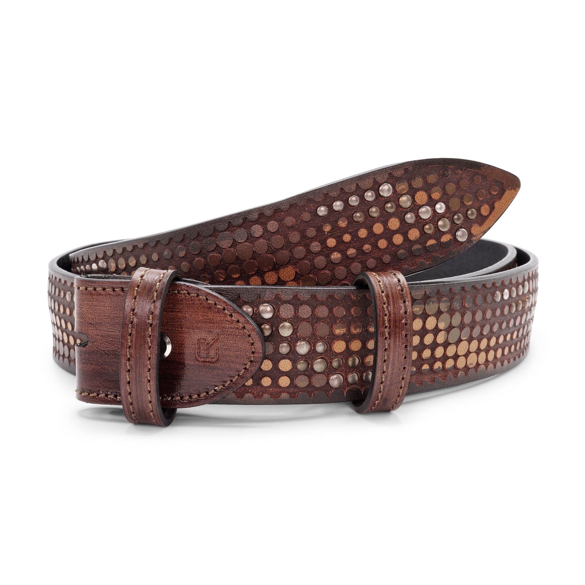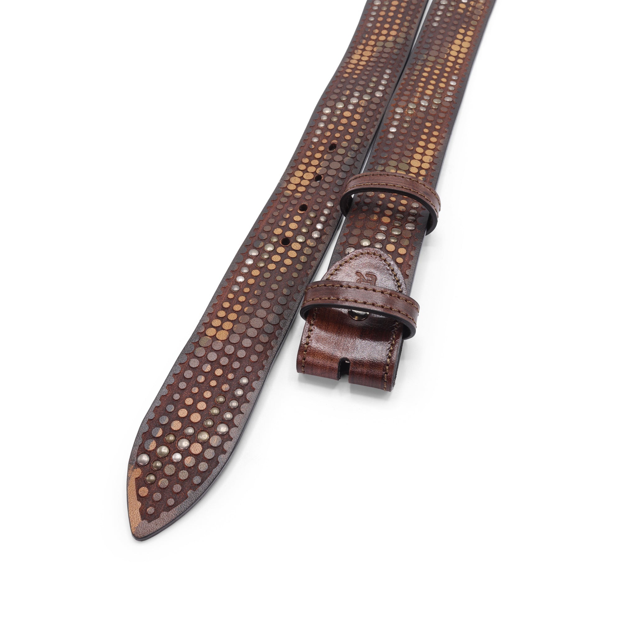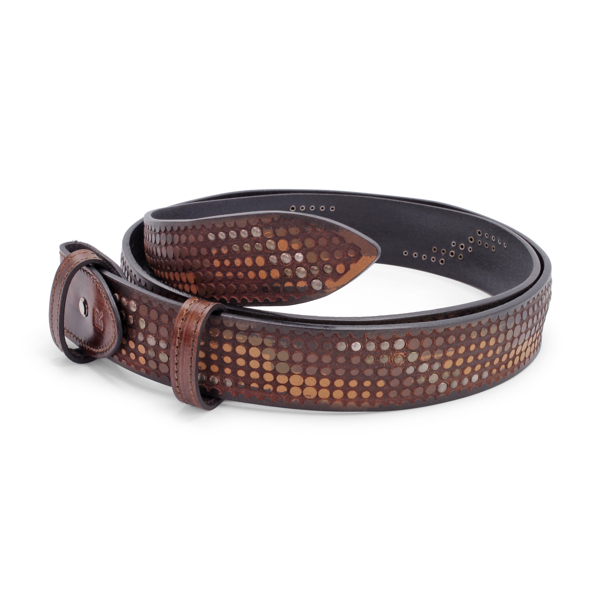 Everyone should have at least one studded belt in their armoury...but of course you expect something a little special from Elliot Rhodes! Made from a vintage feel vegetable tanned leather that is soft and tactile, this belt has a laser etched dimple pattern across the surface of the belt that is interspersed with alternating rows of antique silver and brass rivets. The belt colour is inherently two tone, the main leather colour being burnt away through the lasering process to show a darker tone below and with the tones then softened through the washing process used to give the belt its vintage feel. This is definitely a belt that can serve for a variety of occasions, whether dressed down with denim, channelling a rock n roll vibe or funked up with eveningwear. Feel free to experiment with all manner of buckles, simple, fun, crystal encrusted... just make sure to choose something that has a suitably vintage feel to stay in keeping with the belt design. However you wear it this will be a striking belt that really catches the eye. A timeless addition to any wardrobe.